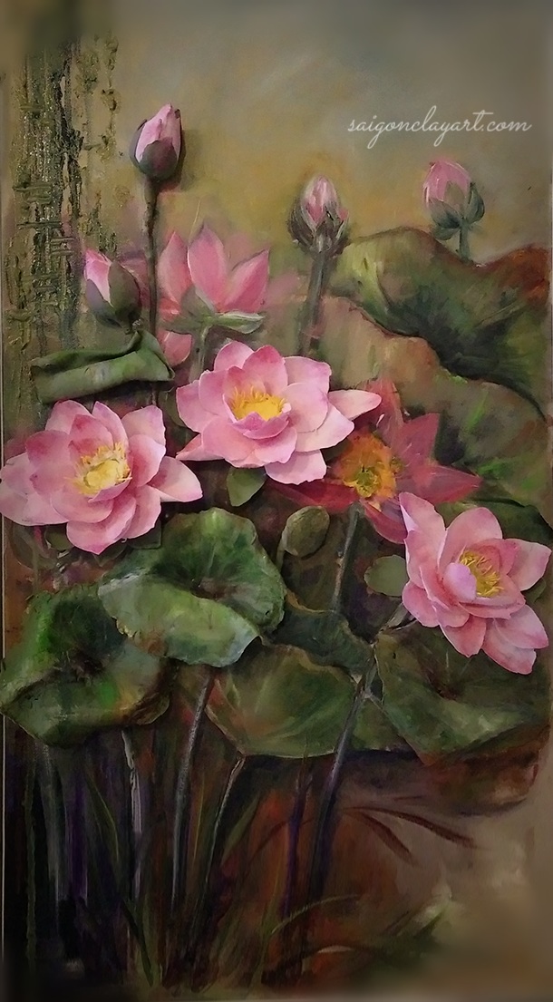 Tranh hoa Nghệ thuật 212 15/01/2018 Saigon Clay Art . Clay Art Painting, Clay flower, Oil painting, Tranh sơn dầu CAP212 – Lotus – 77X52cm