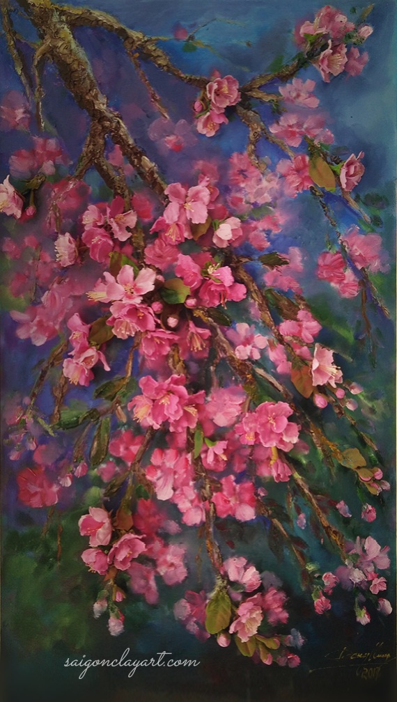 Tranh hoa Nghệ thuật 216 15/01/2018 Saigon Clay Art . Clay Art Painting, Clay flower, Oil painting, Tranh sơn dầu CAP216 – Tác phẩm: Cherry Blossom – 77X52cm