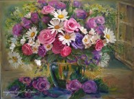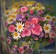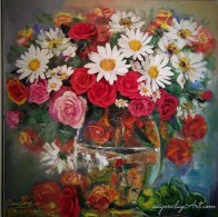 Tranh hoa đất 193 30/08/2017 Saigon Clay Art . Clay Art Painting, Clay flower, Oil painting, Tranh sơn dầu CAP193 – Hồng đỏ & Cúc trắng – Size 60x60cm