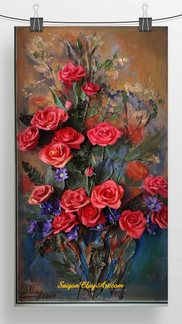 Tranh hoa Nghệ thuật 172 14/04/2017 Saigon Clay Art . Clay Art Painting, Clay flower, Oil painting, Tranh sơn dầu CAP172 – Tác phẩm: Red Roses 1 – Size 40x62cm